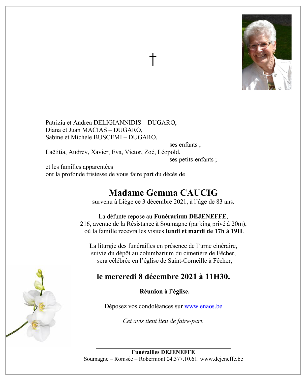 Décédée à Liège (4000, Belgique) le vendredi 3 décembre 2021 à l'âge de 83 ans