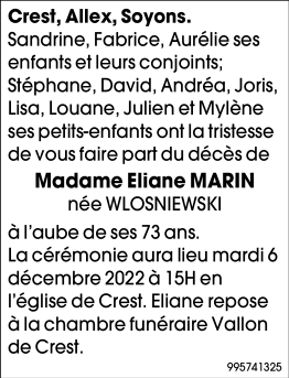 Died in Crest (26400) on 01 December 2022 at the age of 72 years