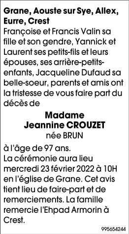 Décédée à Crest (26400) le vendredi 18 février 2022 à l'âge de 97 ans