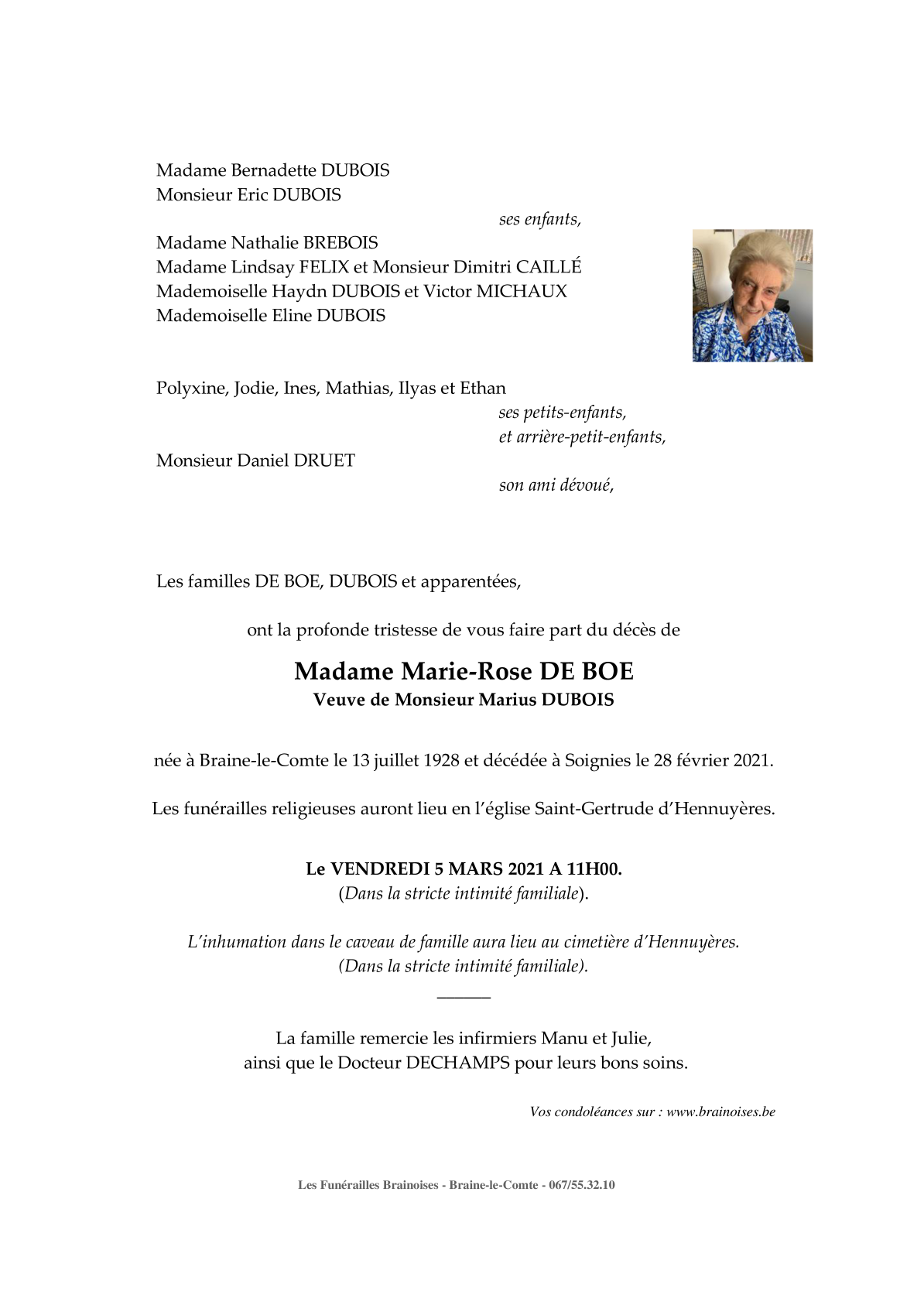 Overleden te Soignies (7060, België) op zondag 28 februari 2021 op 92-jarige leeftijd