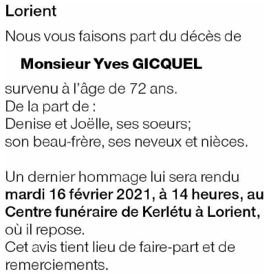 Décédé à Lorient (56100) le vendredi 12 février 2021 à l'âge de 72 ans