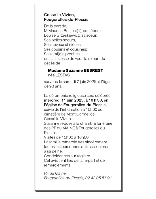 Annonce nécrologique de Mme BESREST Suzanne née LESTAS