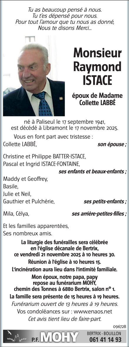 Décédé à Libramont (6800, Belgique) le lundi 17 novembre 2025 à l'âge de 84 ans