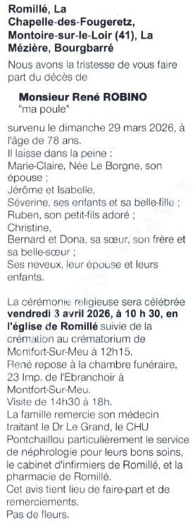 Décédé à Romille (35850) le dimanche 29 mars 2026 à l'âge de 78 ans