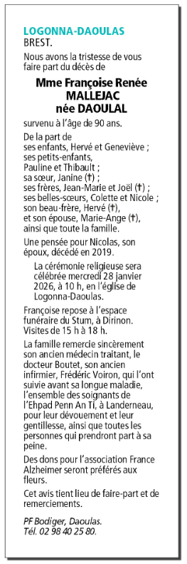 Overleden te Landerneau (29800) op zaterdag 24 januari 2026 op 90-jarige leeftijd