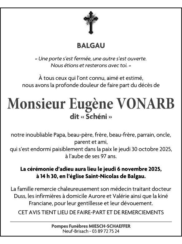 Décédé à Balgau (68740) le jeudi 30 octobre 2025 à l'âge de 96 ans