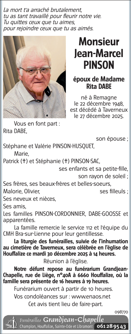 Died in Taverneux (6661, Belgium) on 27 December 2025 at the age of 77 years