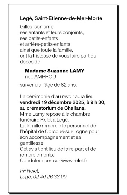 Décédée à Corcoué-sur-Logne (44650) le lundi 15 décembre 2025 à l'âge de 82 ans