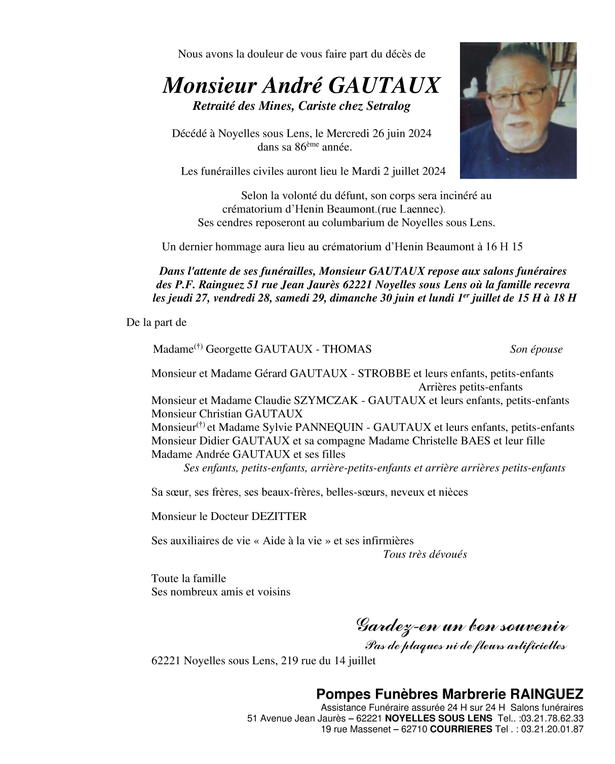 Fallecido en Noyelles-sous-Lens (62221) el miércoles, 26 de junio de 2024 a la edad de 86 años