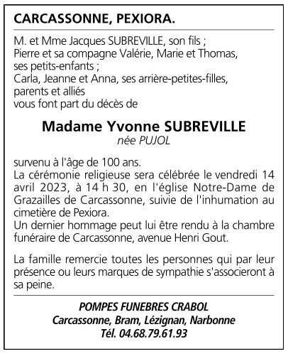 Madame Yvonne SUBREVILLE née PUJOL