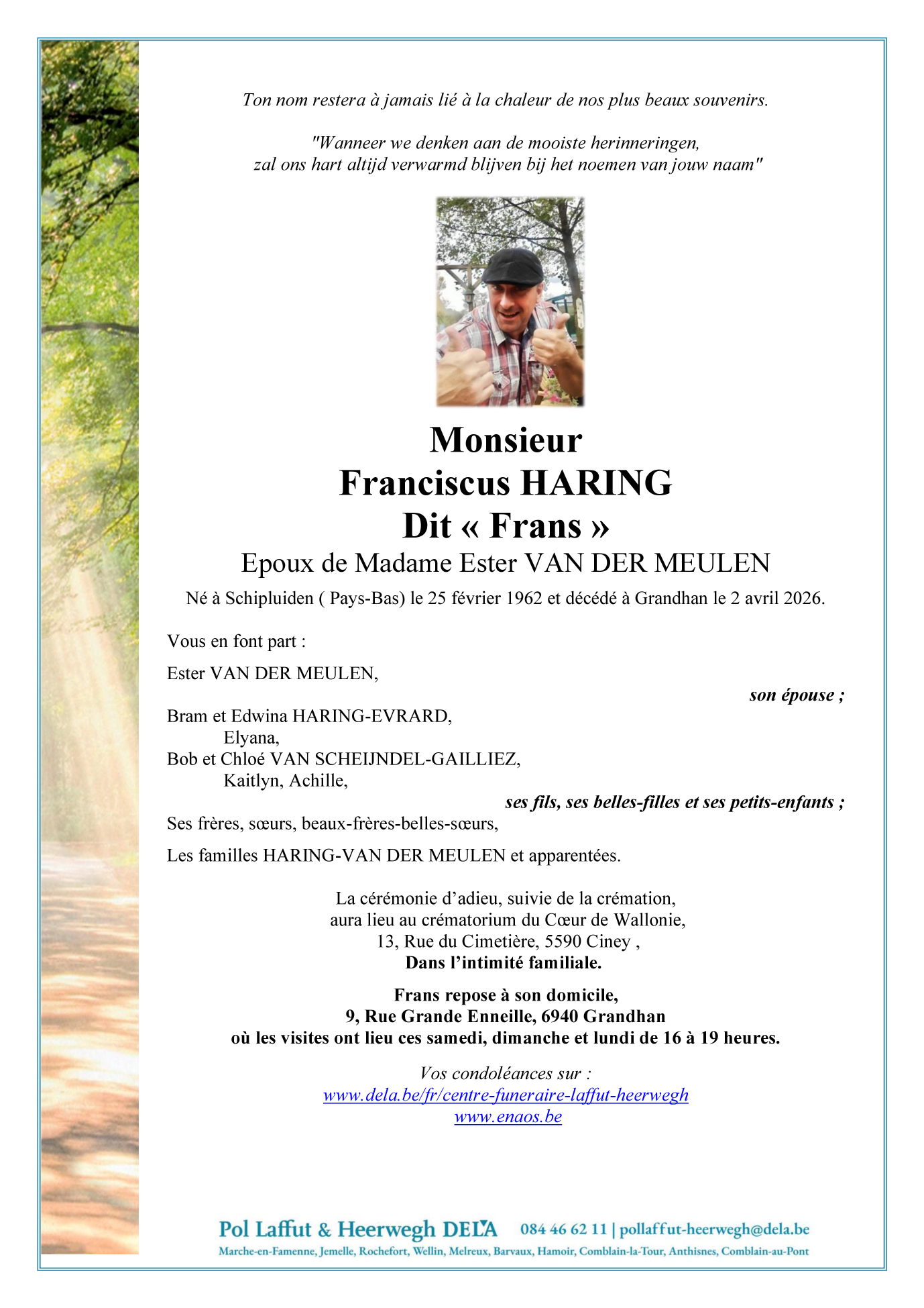 Died in Grandhan (6940, Belgium) on 02 April 2026 at the age of 64 years