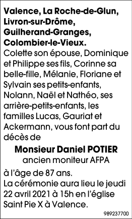 Décédé à Valence (26000) le lundi 19 avril 2021 à l'âge de 87 ans
