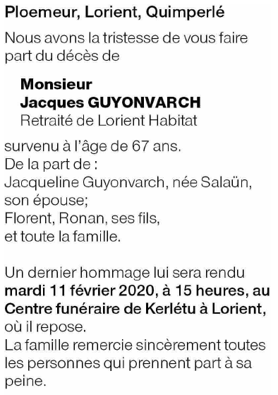 Décédé à Ploemeur (56270) le vendredi 7 février 2020 à l'âge de 67 ans