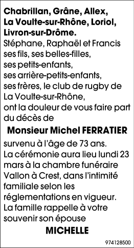 Décédé à Valence (26000) le mercredi 18 mars 2020 à l'âge de 73 ans