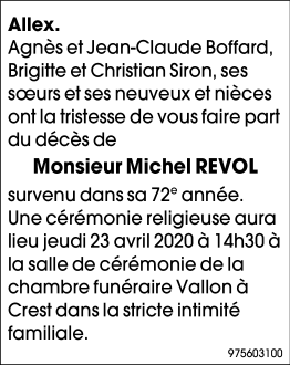 Fallecido en Valence (26000) el lunes, 20 de abril de 2020 a la edad de 71 años