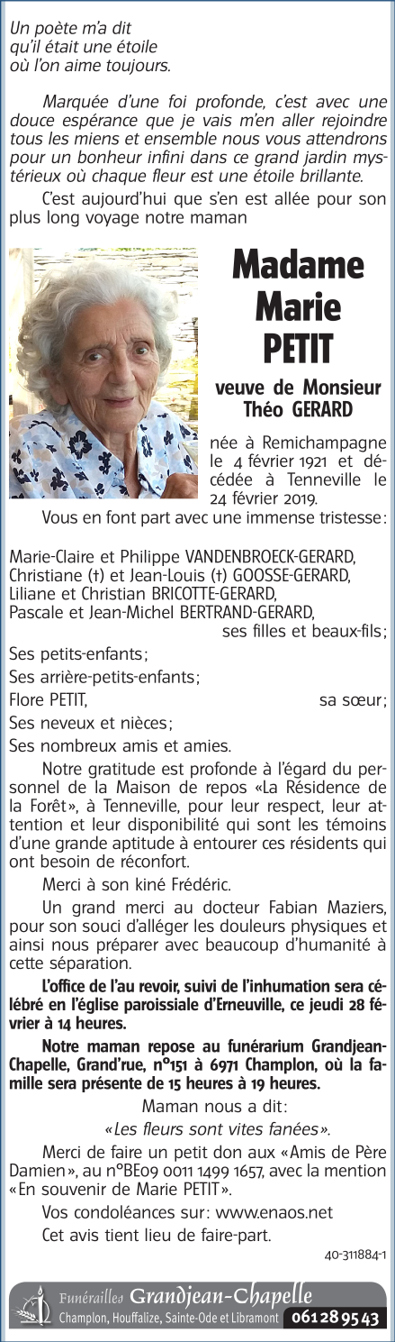 Décédée à Tenneville (6970, Belgique) le dimanche 24 février 2019 à l'âge de 98 ans