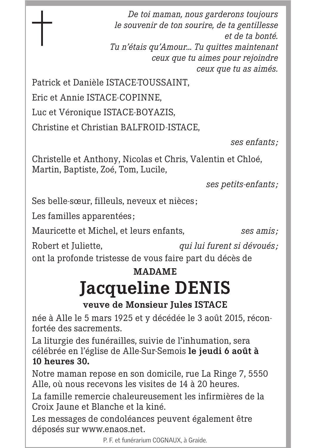 Fallecida en Alle (5550, Bélgica) el lunes, 3 de agosto de 2015 a la edad de 90 años
