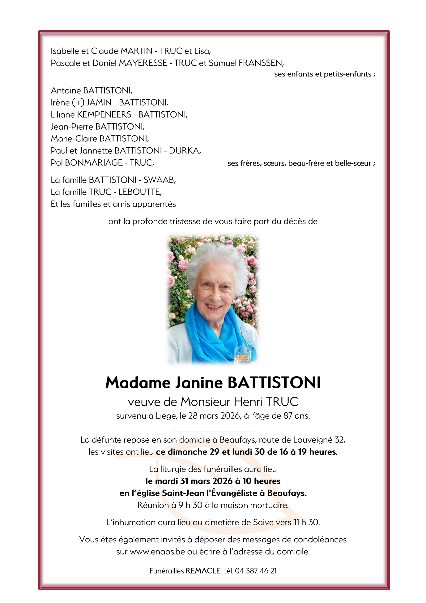 Died in Liège (4000, Belgium) on 28 March 2026 at the age of 87 years