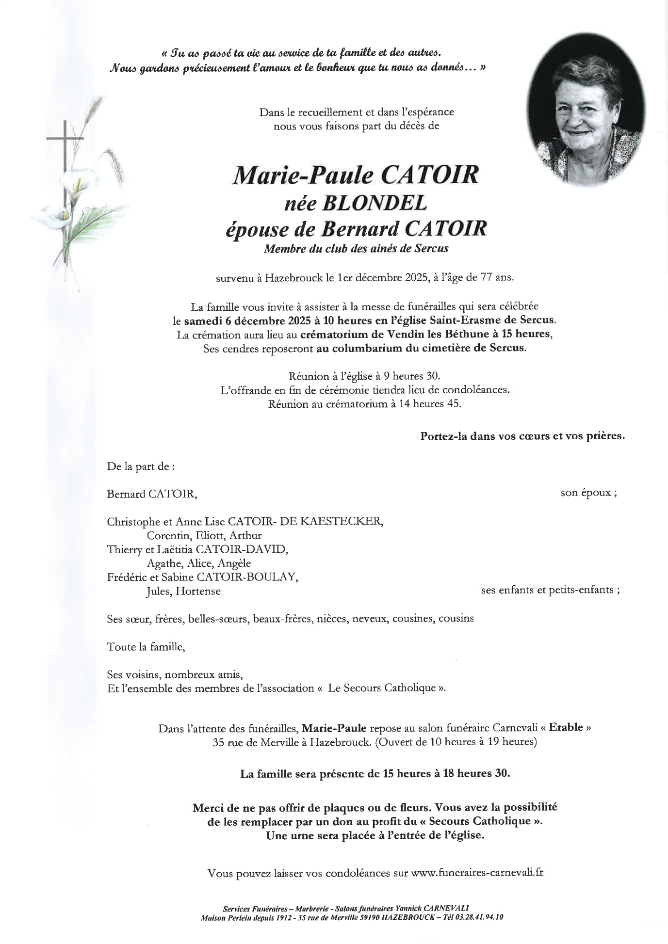 Décédée à Hazebrouck (59190) le lundi 1 décembre 2025 à l'âge de 77 ans