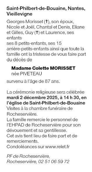 Décédée à Rocheservière (85620) le samedi 29 novembre 2025 à l'âge de 87 ans