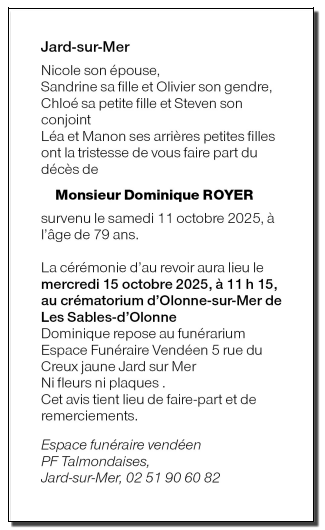 Décédé à Les Sables d'Olonne (85340) le samedi 11 octobre 2025 à l'âge de 79 ans