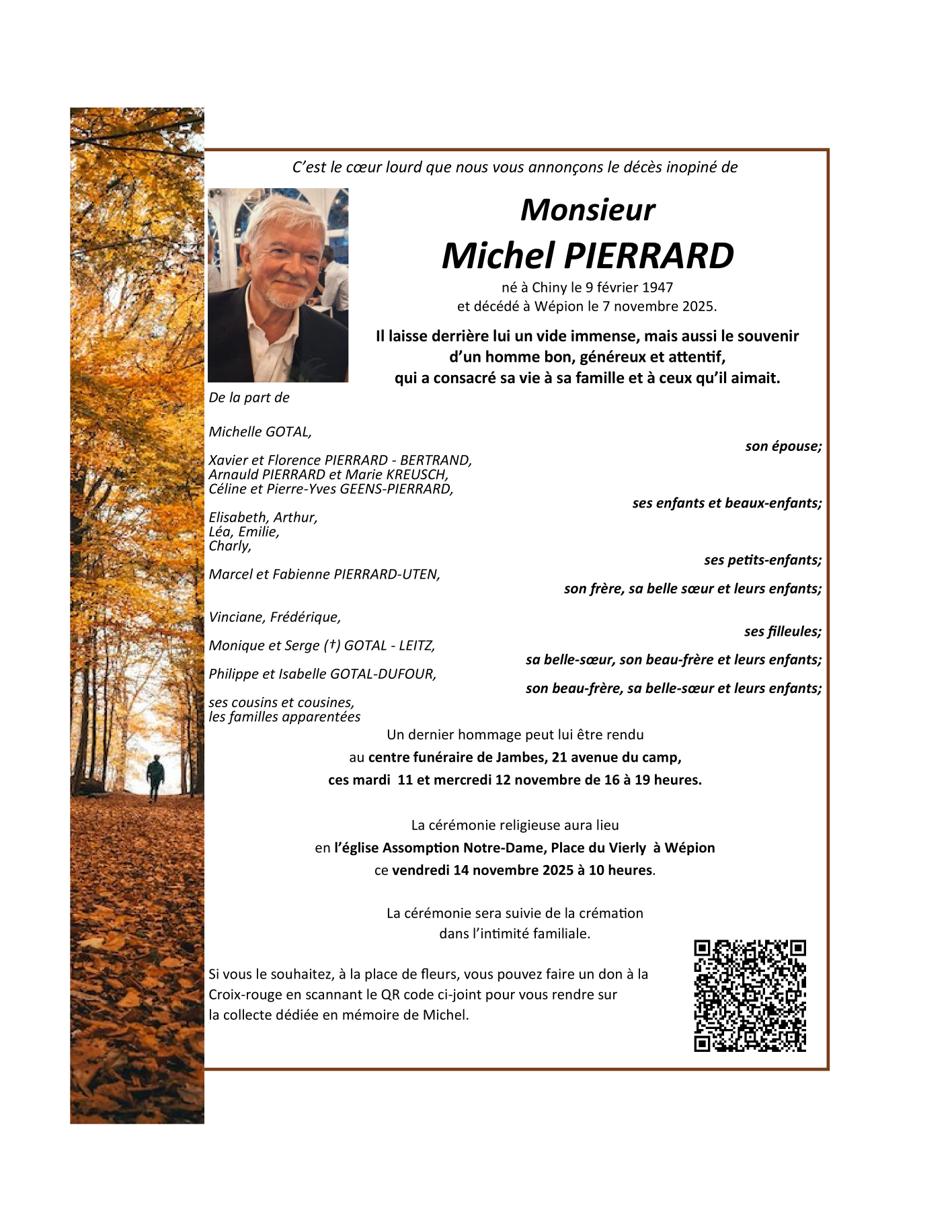 Died in Wépion (5100, Belgium) on 07 November 2025 at the age of 78 years