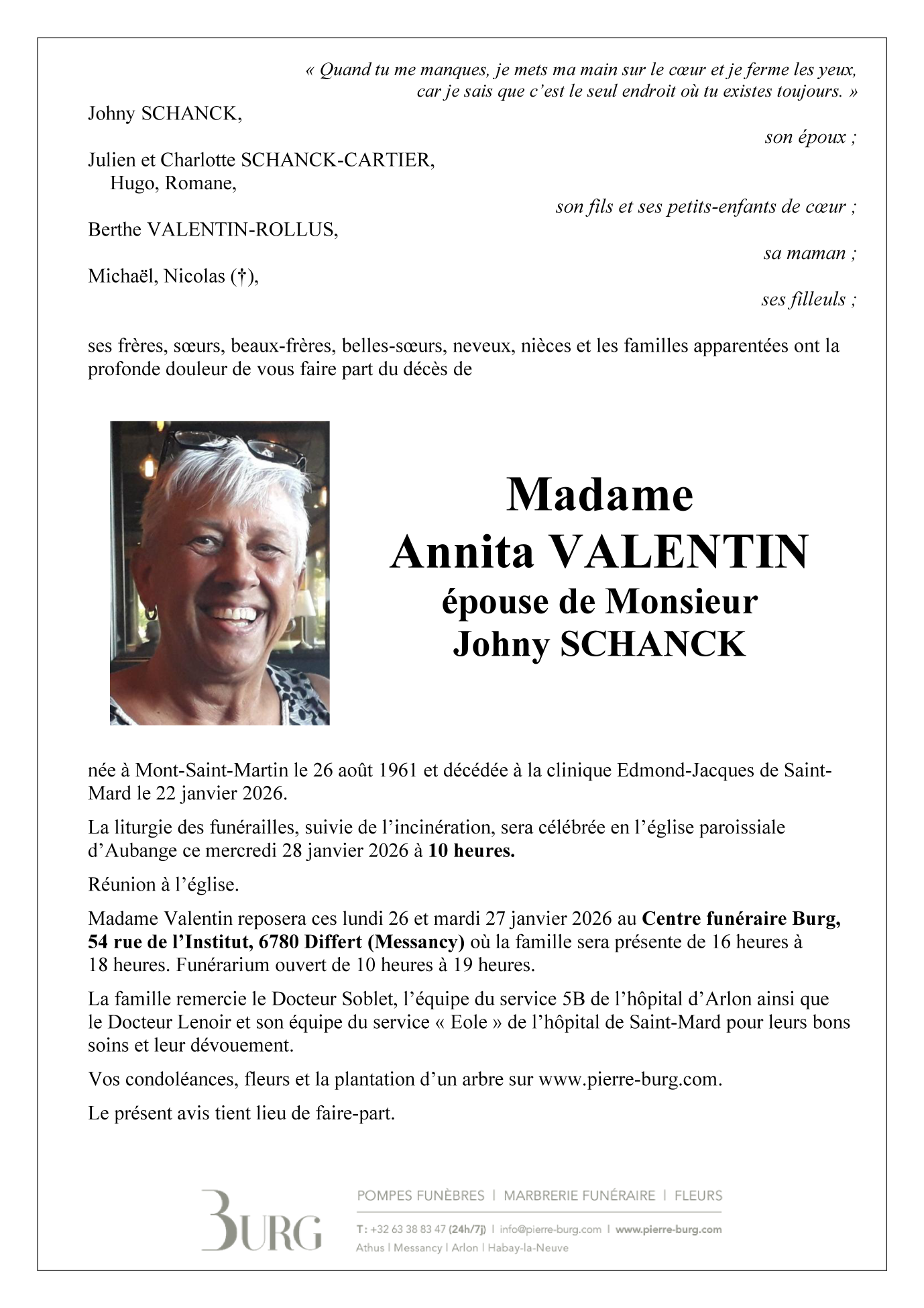 Fallecida en Saint-Mard (6762, Bélgica) el jueves, 22 de enero de 2026 a la edad de 64 años