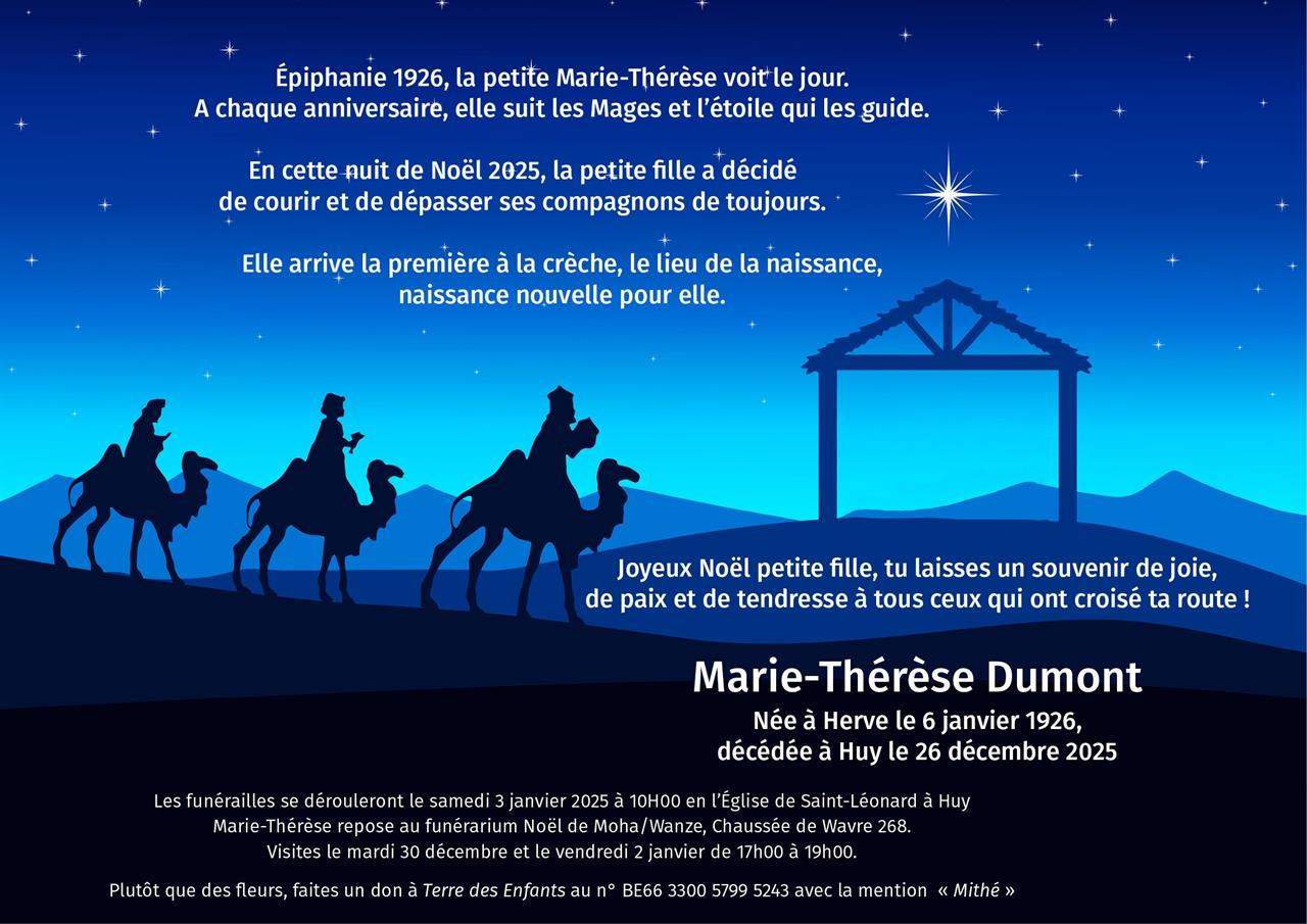 Décédée à Huy (4500, Belgique) le vendredi 26 décembre 2025 à l'âge de 99 ans