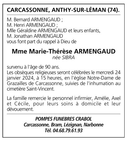Décédée à Carcassonne (11000) le dimanche 21 janvier 2024 à l'âge de 90 ans