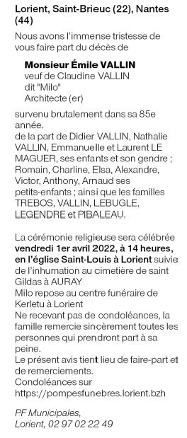 Overleden te Lorient (56100) op dinsdag 29 maart 2022 op 84-jarige leeftijd