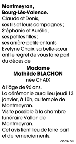 Décédée à Romans-sur-Isère (26100) le lundi 10 janvier 2022 à l'âge de 96 ans