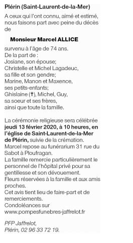 Décédé à Plérin (22190) le dimanche 9 février 2020 à l'âge de 74 ans