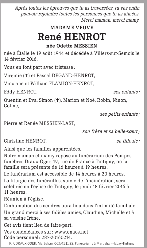 Madame veuve René HENROT née Odette MESSIEN