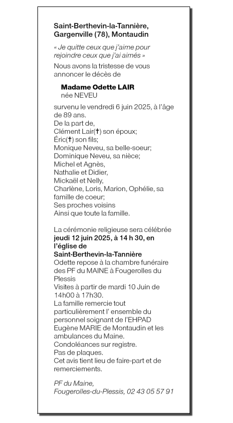 Annonce nécrologique de Mme Odette LAIR née NEVEU
