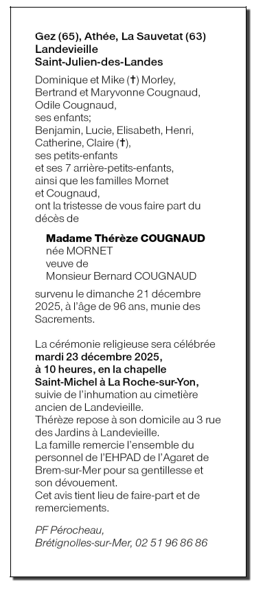 Décédée à Brem-sur-Mer (85470) le dimanche 21 décembre 2025 à l'âge de 96 ans