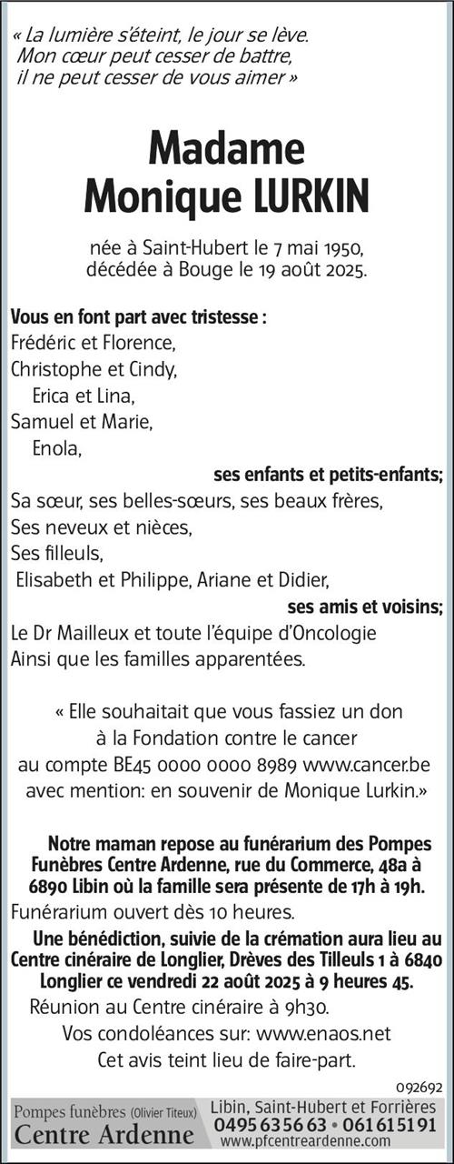 Née à Saint-Hubert (6870, Belgique) le dimanche 7 mai 1950