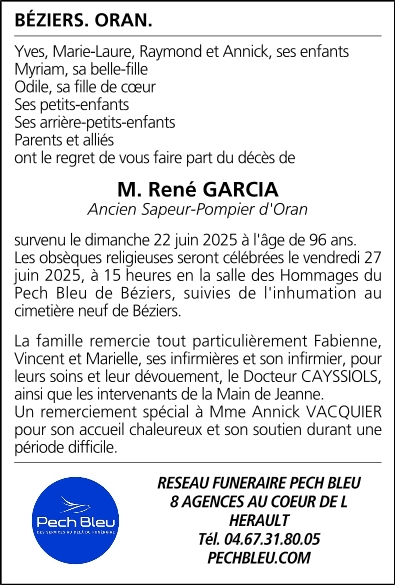 Décédé à Béziers (34500) le dimanche 22 juin 2025 à l'âge de 96 ans