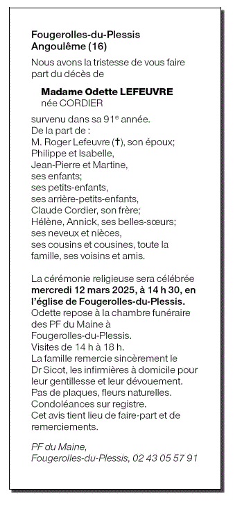 Annonce nécrologique de Madame Odette LEFEUVRE née CORDIER
