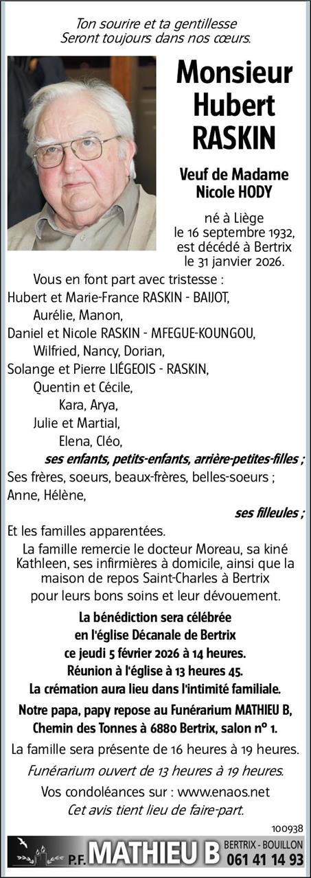Décédé à Bertrix (6880, Belgique) le samedi 31 janvier 2026 à l'âge de 93 ans