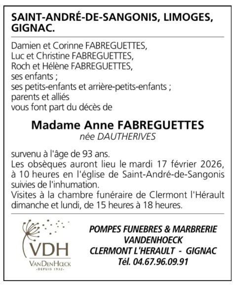 Décédée à Gignac (34150) le vendredi 13 février 2026 à l'âge de 93 ans