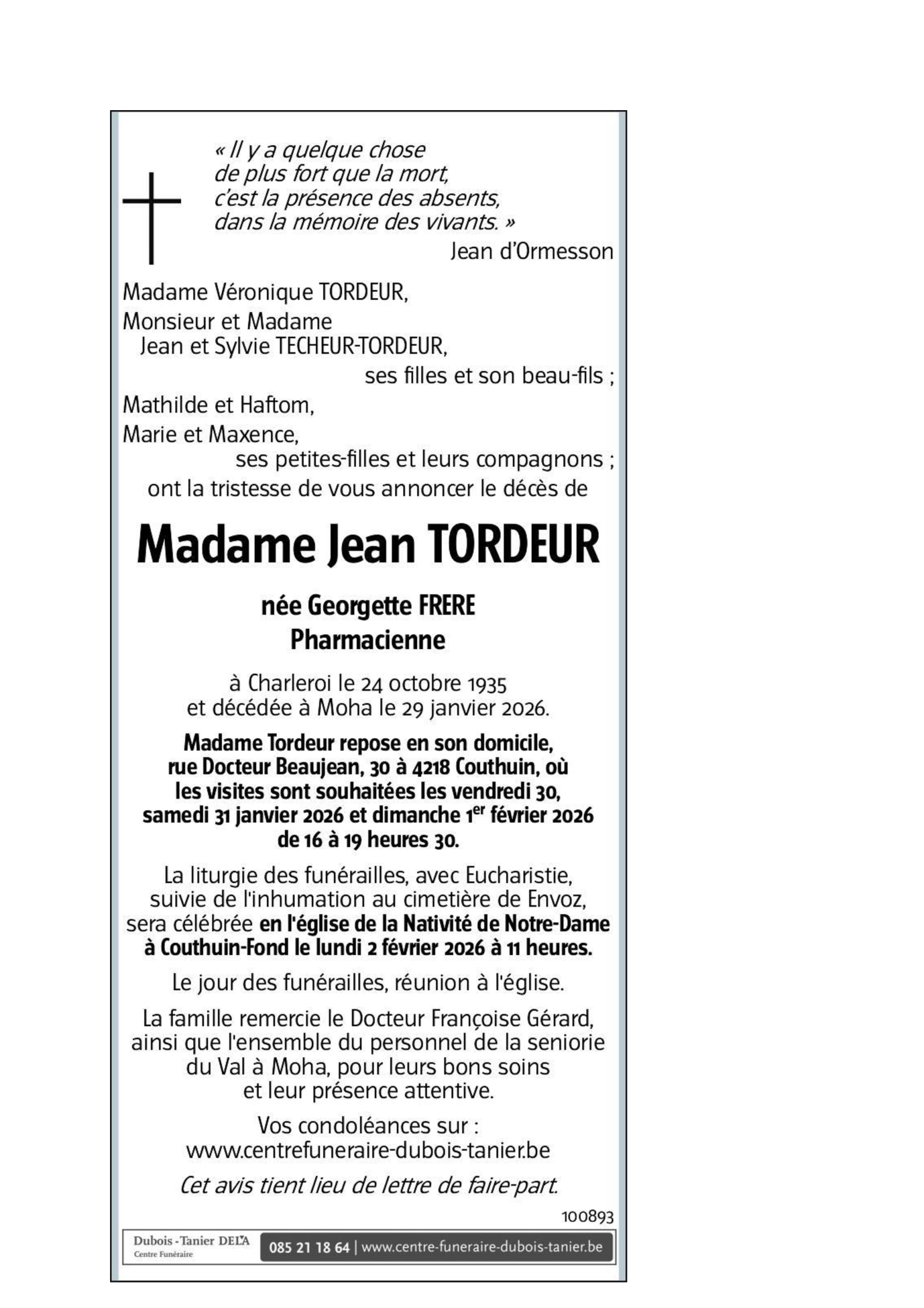 Veuve de Monsieur Jean TORDEUR