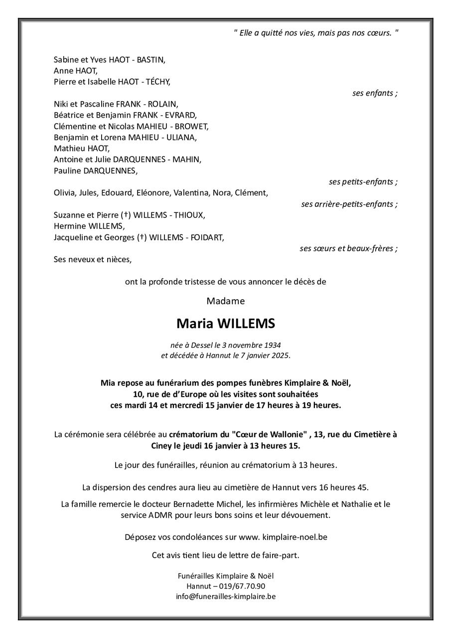 Décédée à Hannut (4280, Belgique) le mardi 7 janvier 2025 à l'âge de 90 ans