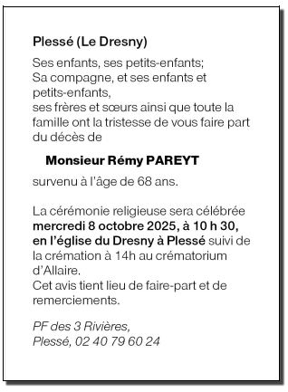 Overleden te Plessé (44630) op woensdag 1 oktober 2025 op 68-jarige leeftijd