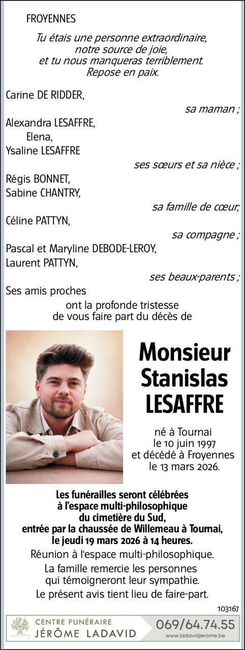 Décédé à Froyennes (7503, Belgique) le vendredi 13 mars 2026 à l'âge de 28 ans