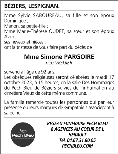 Décédée à Béziers (34500) le jeudi 12 octobre 2023 à l'âge de 92 ans