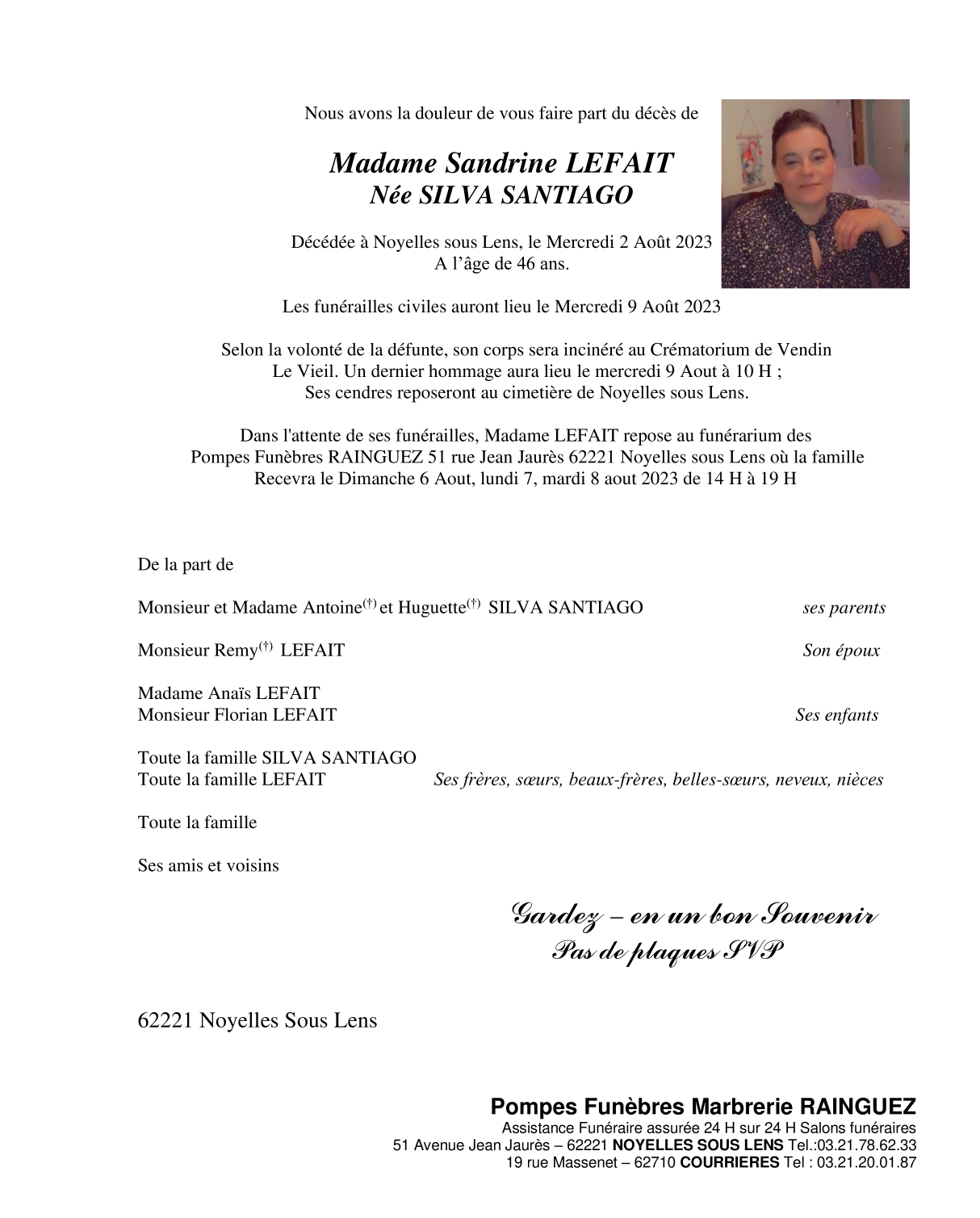 Madame SANDRINE LEFAIT née SILVA SANTIAGO