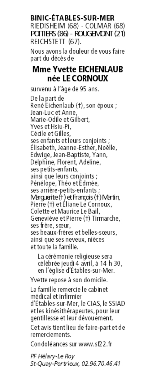 Madame Yvette EICHENLAUB née LE CORNOUX