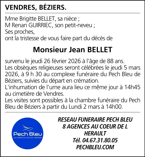 Décédé à Vendres (34350) le jeudi 26 février 2026 à l'âge de 88 ans