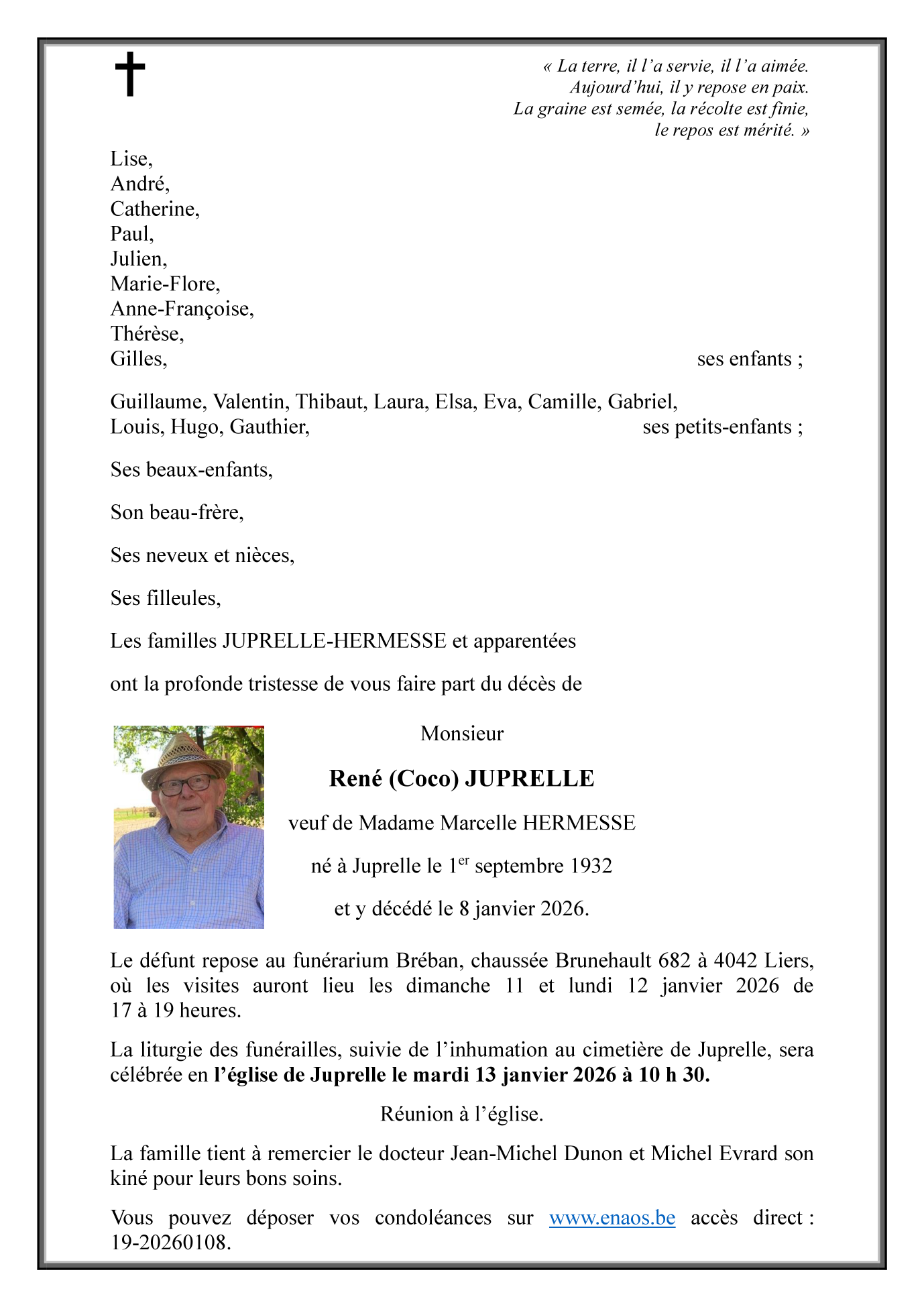 Monsieur René (Coco) JUPRELLE veuf de Marcelle HERMESSE