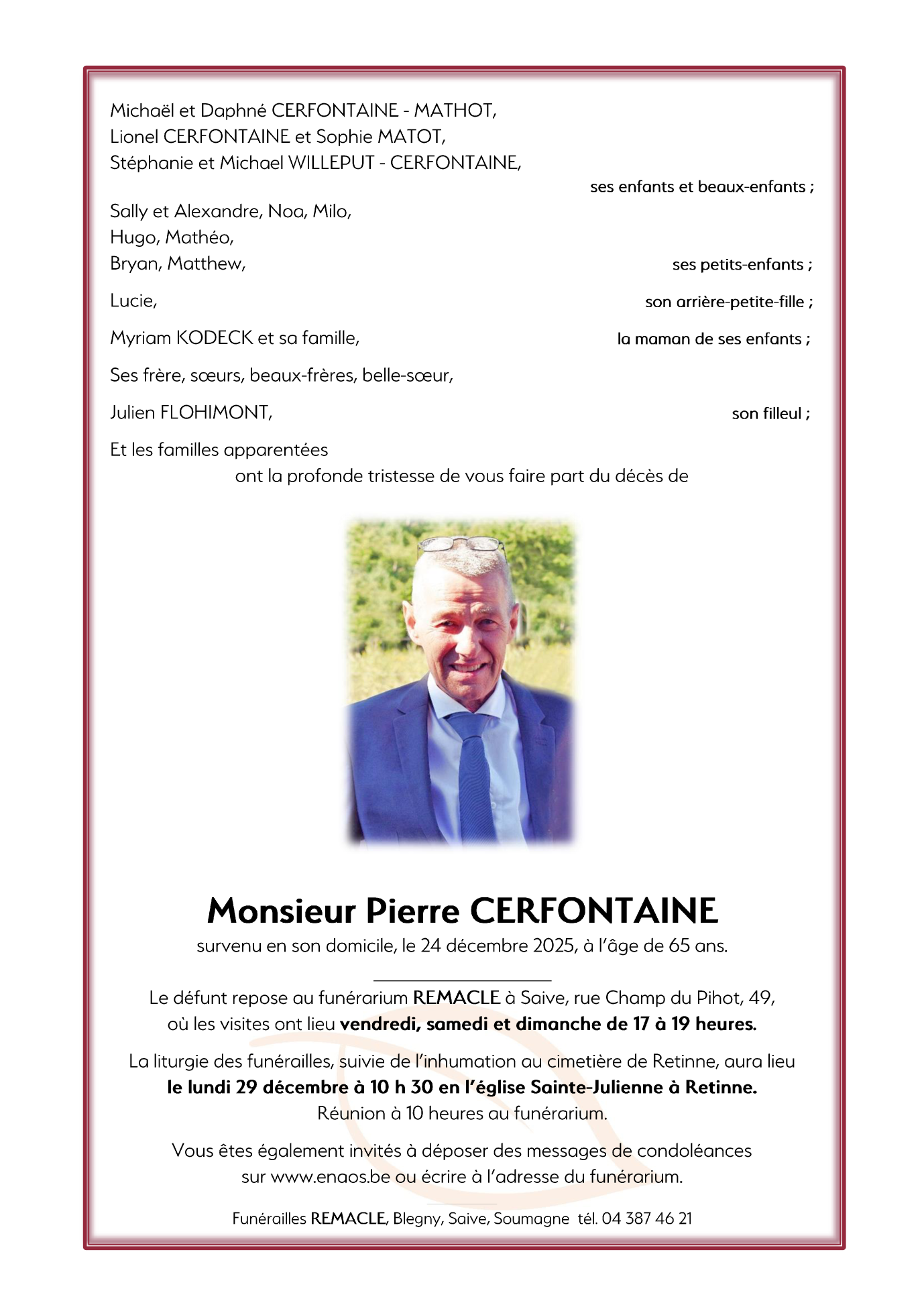 Décédé à Retinne (4621, Belgique) le mercredi 24 décembre 2025 à l'âge de 65 ans